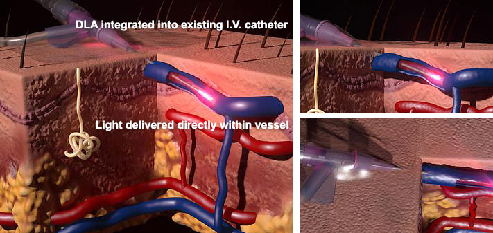 Key benefits emerge from the direct-to-blood intervention of the UVLrx Treatment System™. First, integration into a standard IV catheter eases the burden of use. There is no need to initiate an additional catheter site to accommodate the treatment. Second, there is no foreign body response as the blood remains within its natural environment. Third, and most important, nearly 100% of a patient's total blood volume can receive a therapeutic dose of light, maximizing the health benefits.
